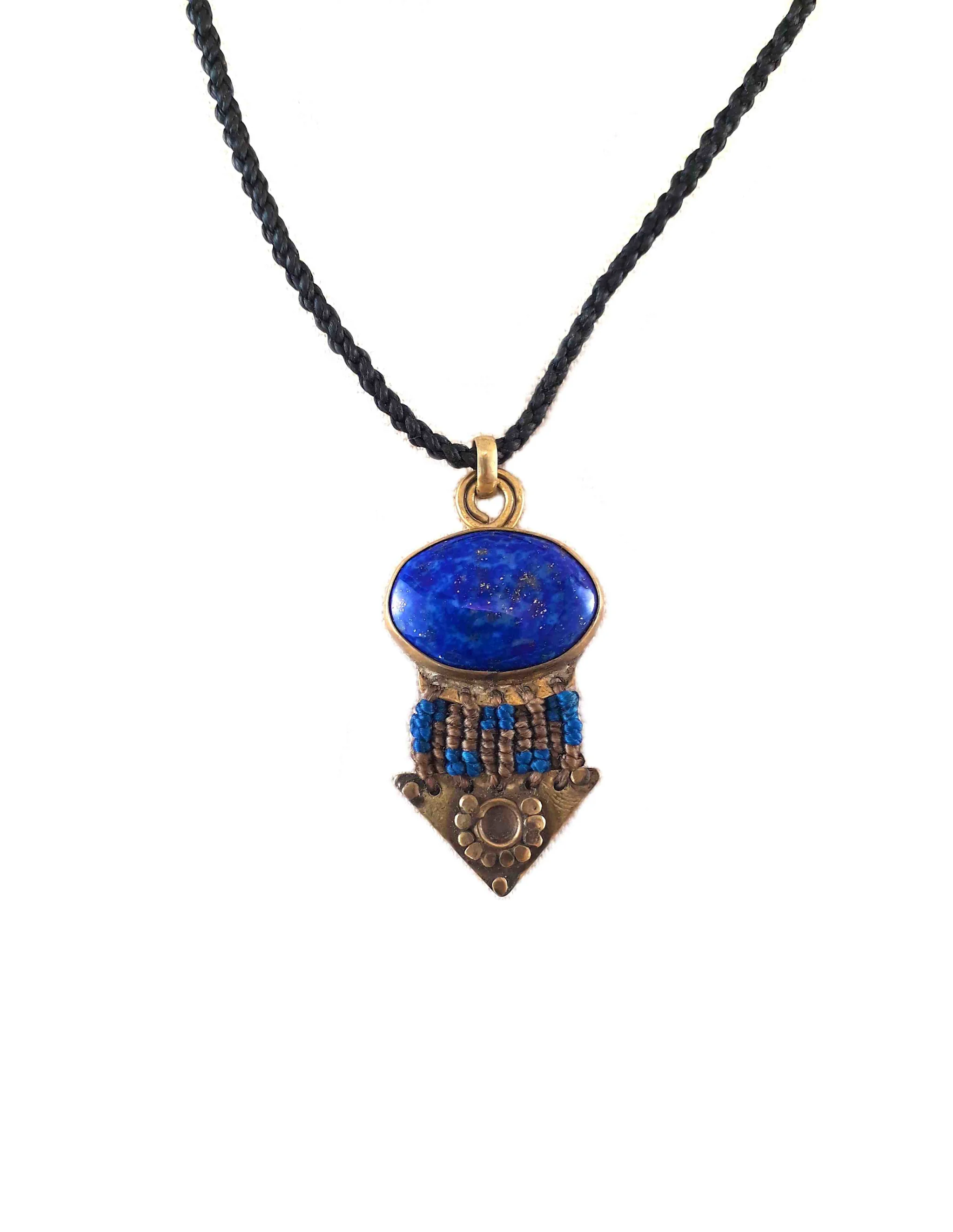 Collier en macramé avec un lapis lazuli serti en laiton. Le lapis lazuli est une roche utilisée depuis plus de 7000 ans dans de nombreux endroits du monde. Il fut travaillé dans de nombreux domaines de l'artisanat dans l'Égypte antique, mais aussi au moyen-âge, comme pigment pour la peinture. Il se vendait d'ailleurs parfois à un prix plus élevé que l'or. En effet, durant de nombreux siècles, la seule mine connue de Lapis Lazuli se trouvait en Afghanistan.